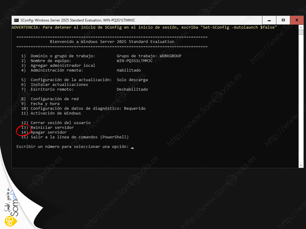 Entre las opciones de SConfig, la número 13 nos permite reiniciar el servidor y la 14 apagarlo.