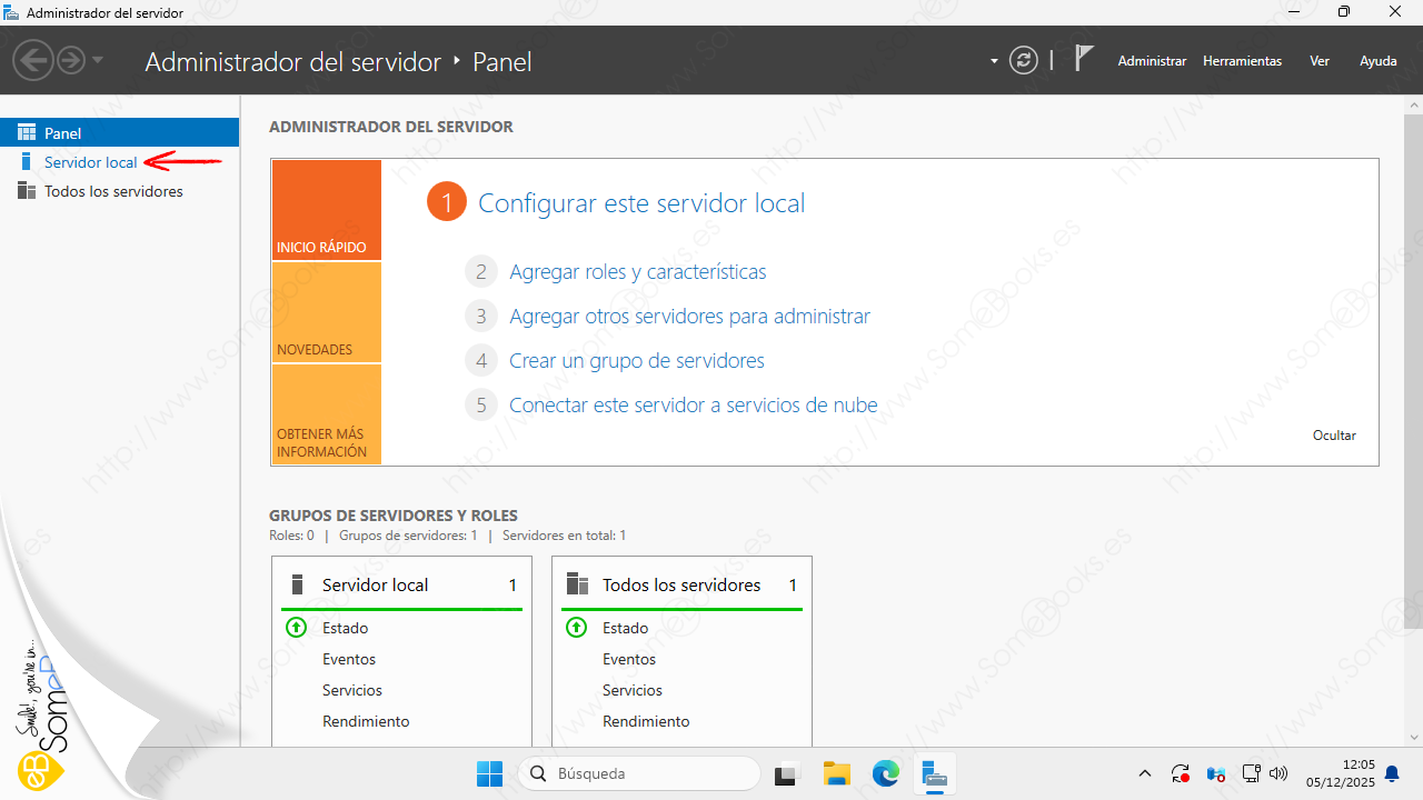 Si acabas de iniciar el servidor, es posible que se haya abierto de forma automática el Administrador del servidor. Aunque si no es así, o ya lo has cerrado, siempre puedes volver a abrirlo haciendo clic sobre el botón Inicio.