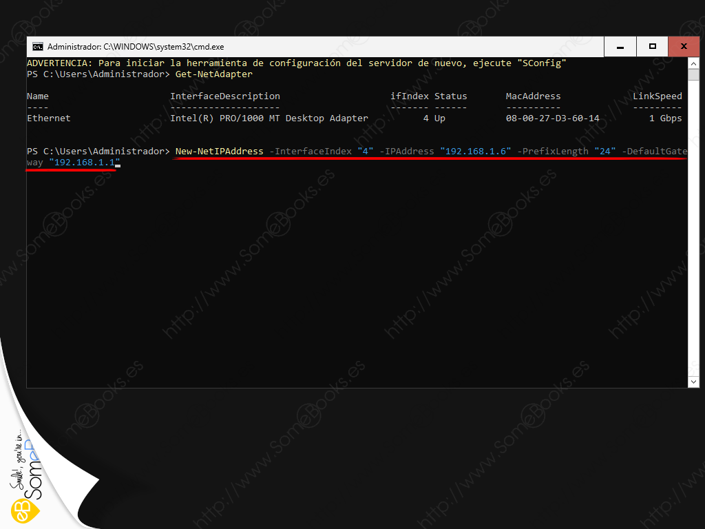 Lo siguiente que haremos será fijar los valores para la dirección IP, la máscara de subred y la puerta de enlace. Algo tan sencillo como escribir el siguiente cmdlet: