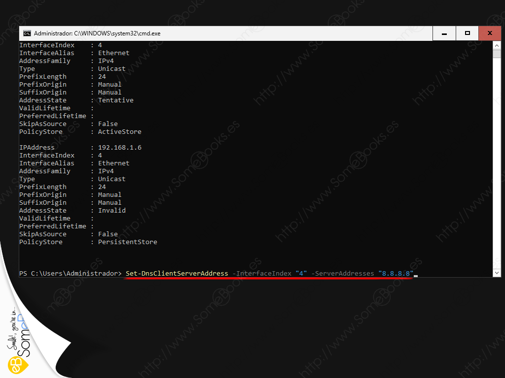 Como antes, el argumento -InterfaceIndex identifica al adaptador sobre el que vamos a actuar. Por su parte, el argumento -ServerAddresses indica la dirección IP del ordenador que actuará como servidor DNS.