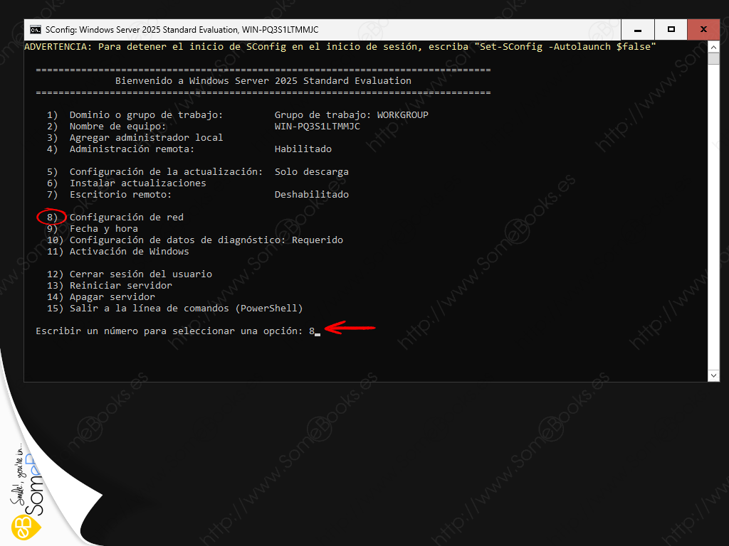 Con el menú de SConfig en la pantalla, centramos nuestra atención en la línea con el texto 8) Configuración de red que, evidentemente, es la que nos interesa.