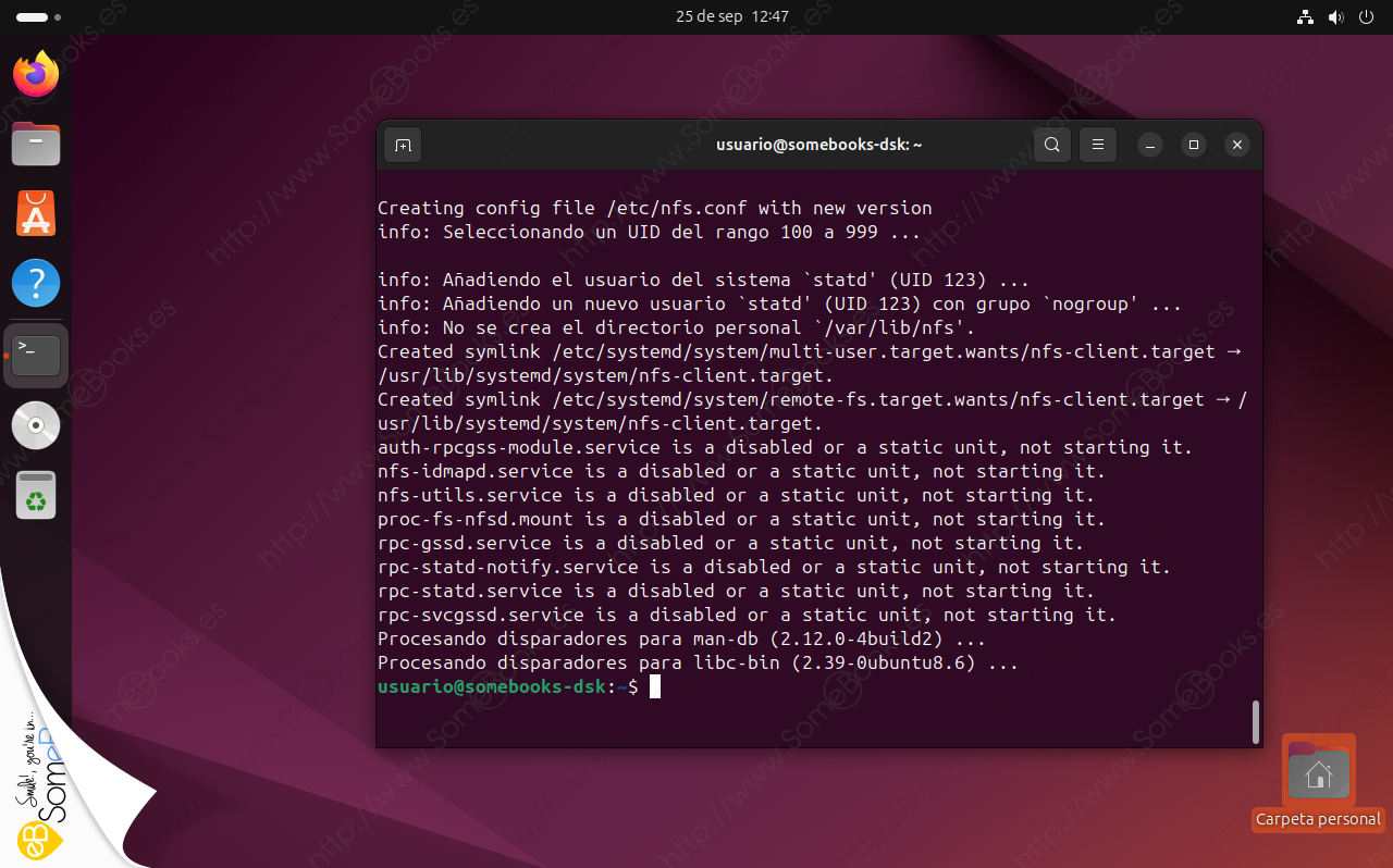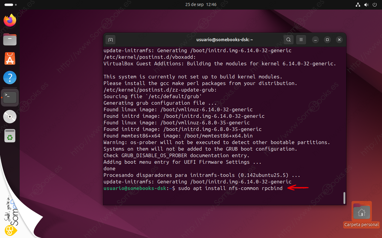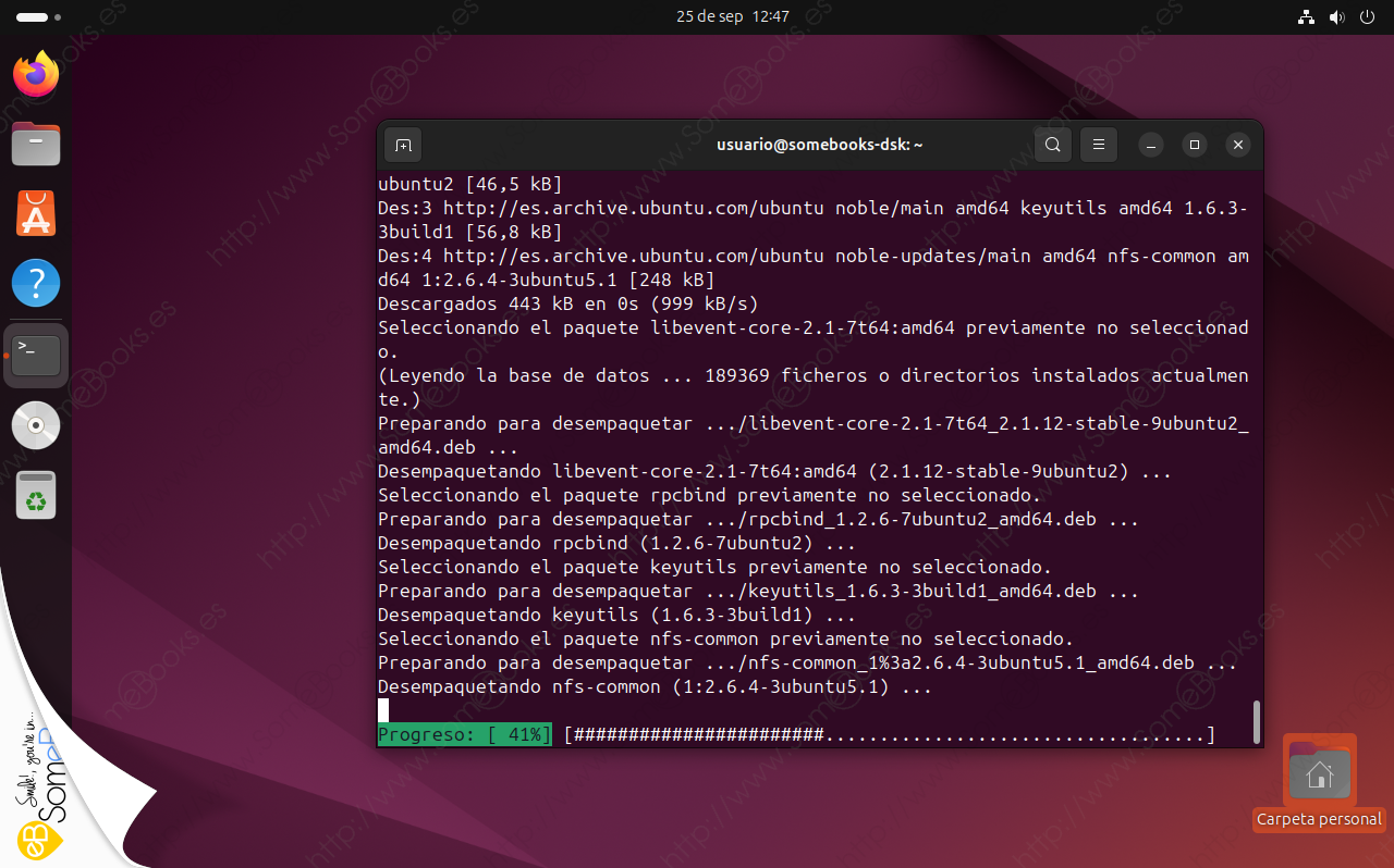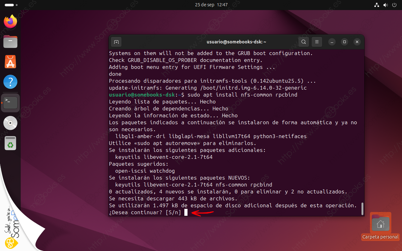 Cuando se haya completado la actualización, estaremos listos para instalar NFS en el cliente. Si la instalación en el servidor parece fácil, en los clientes no lo es menos. En el caso particular de un cliente con Ubuntu 24.04 LTS, sólo tendremos que instalar los paquetes nfs-common y rpcbind.