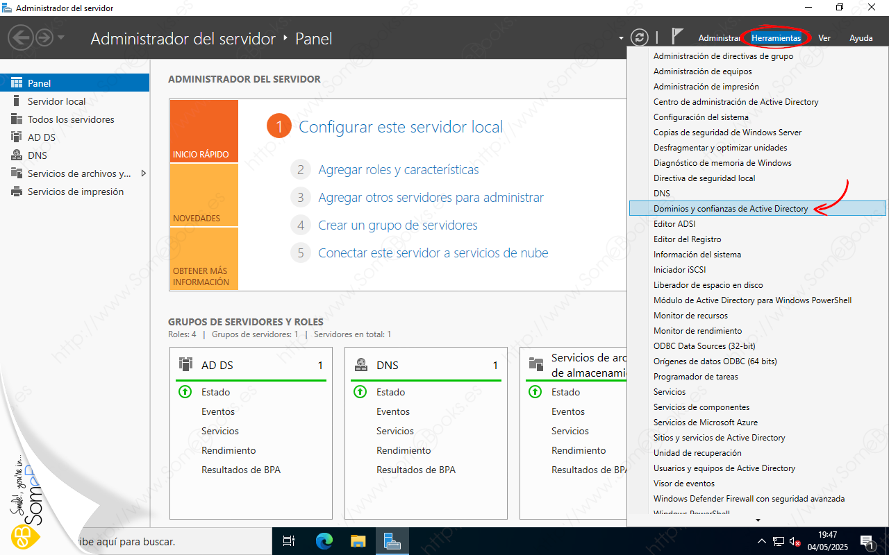 Para establecer una relación de confianza entre dos bosques diferentes, partiremos desde el controlador de dominio que actúe como Maestro de Operaciones (FSMO – Flexible Single Master Operations) en cualquiera de los bosques implicados. Es decir, en nuestro ejemplo, podemos partir del equipo Server-2022-A (que es el maestro de operaciones de somebooks.local) o del equipo Server-2022-D (que es el maestro de operaciones de sliceoflinux.local).