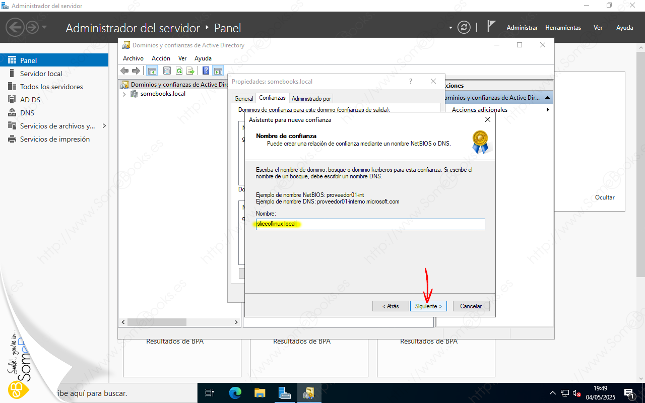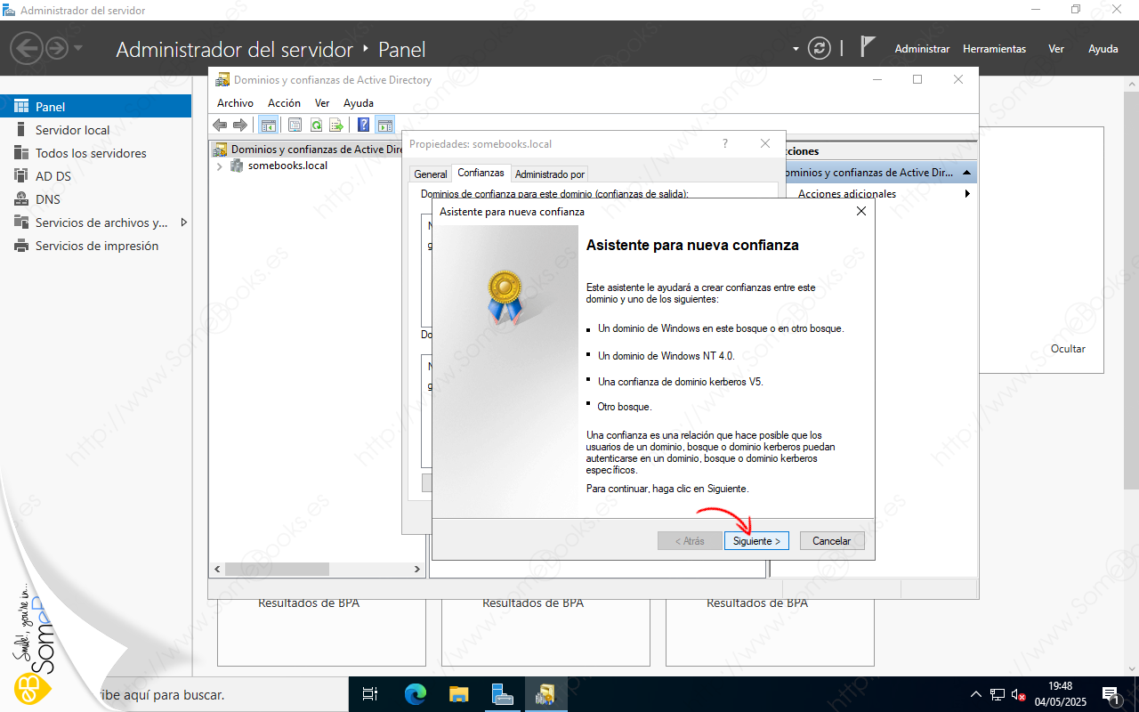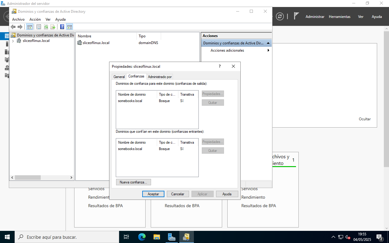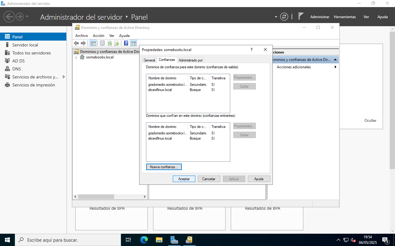 Veremos que aparece una ventana titulada Propiedades somebooks.local (o como se llame tu dominio). En ella, elegiremos la solapa Confianzas.