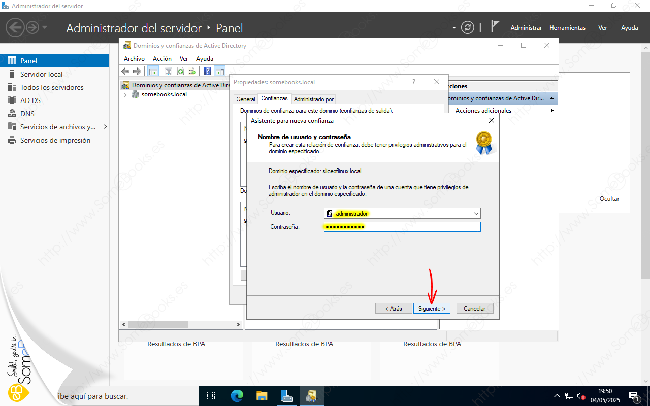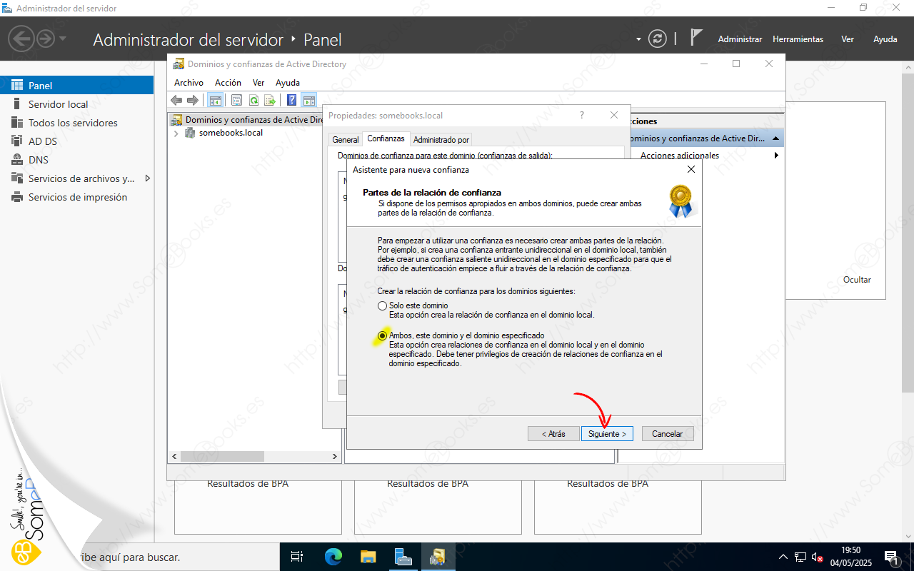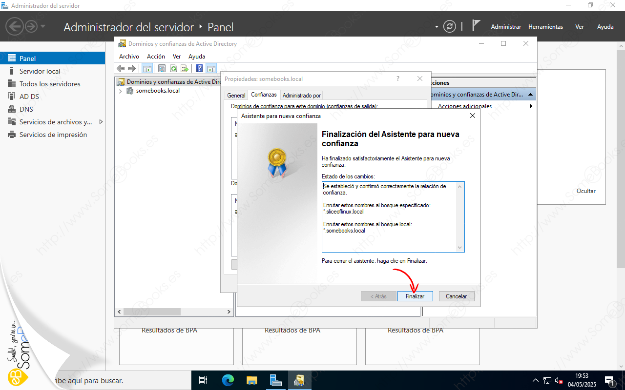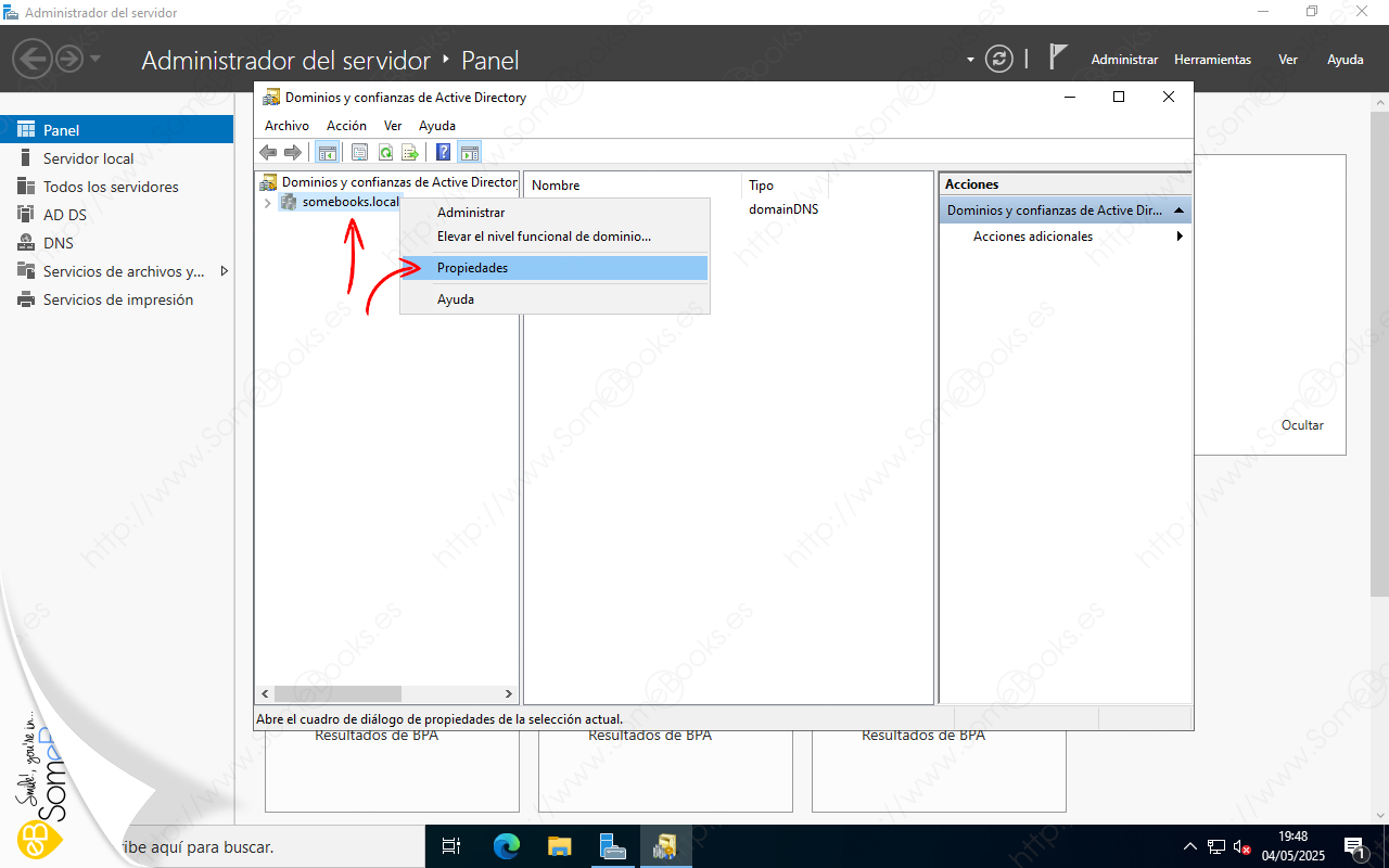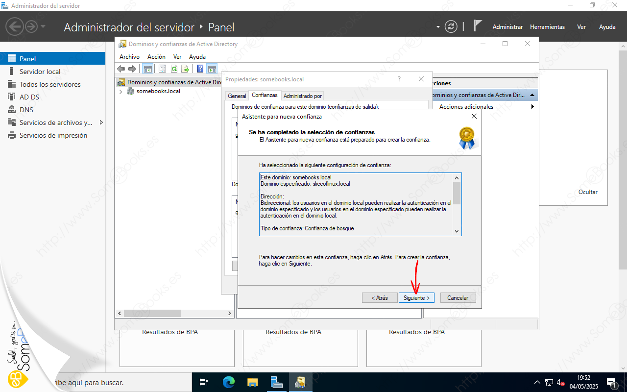 Veremos que aparece una ventana titulada Propiedades somebooks.local (o como se llame tu dominio). En ella, elegiremos la solapa Confianzas.