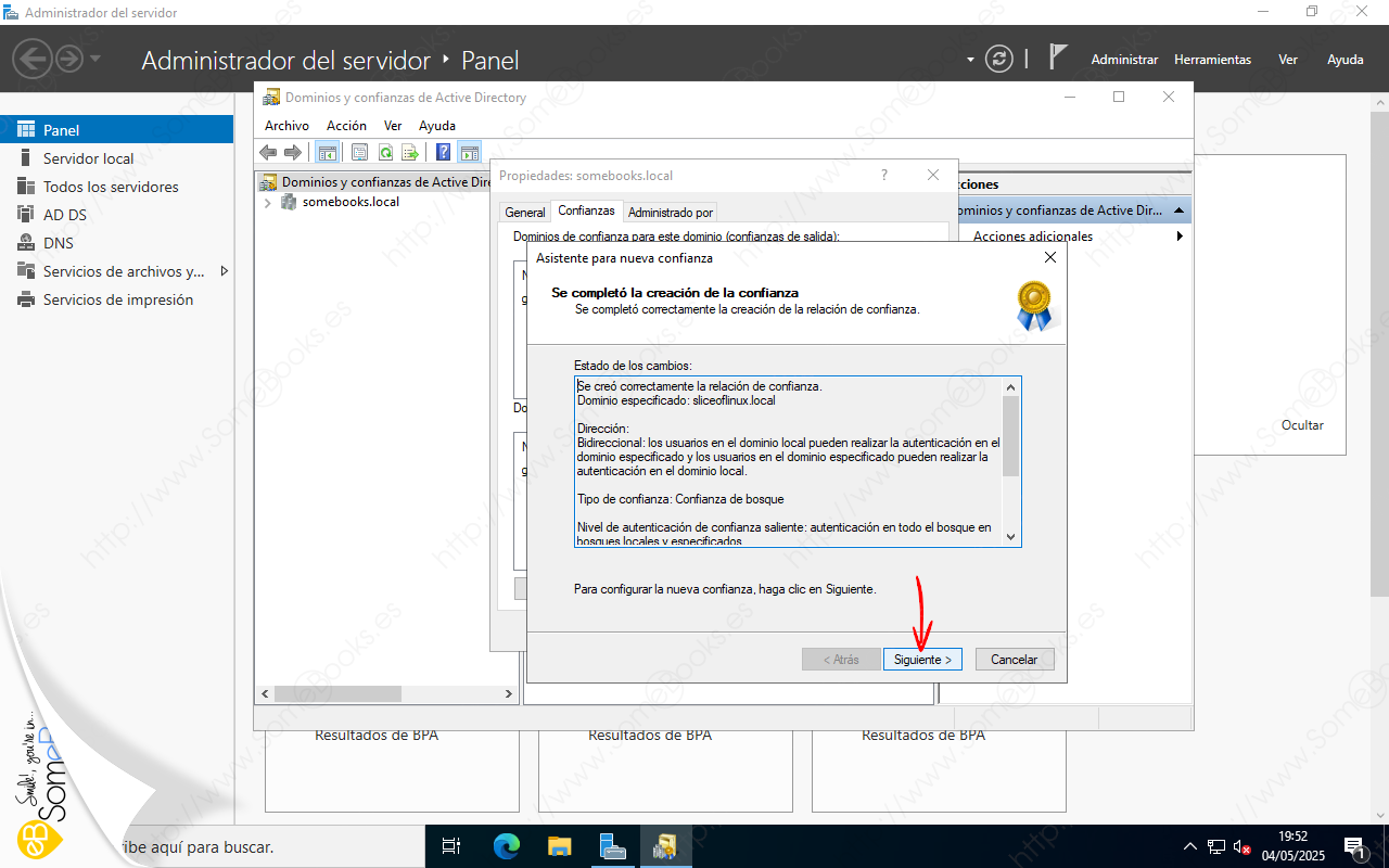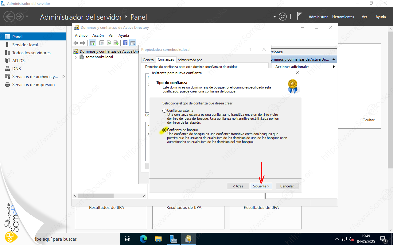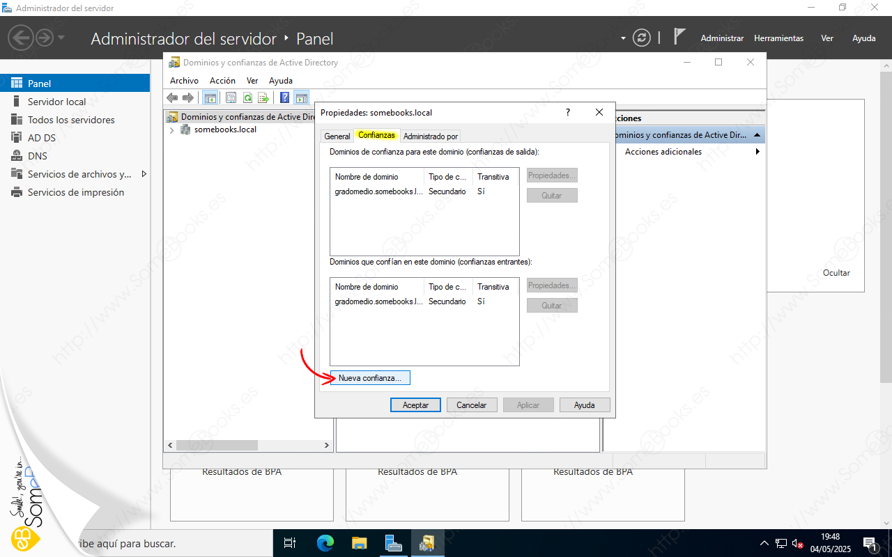 Veremos que ya aparece la confianza que se estableció de forma automática cuando creamos el subdominio gradomedio.somebooks.local (ver artículos anteriores de esta serie). Sin embargo, en estos momentos, la confianza con el subdominio no nos interesa. Lo que haremos será crear una nueva.