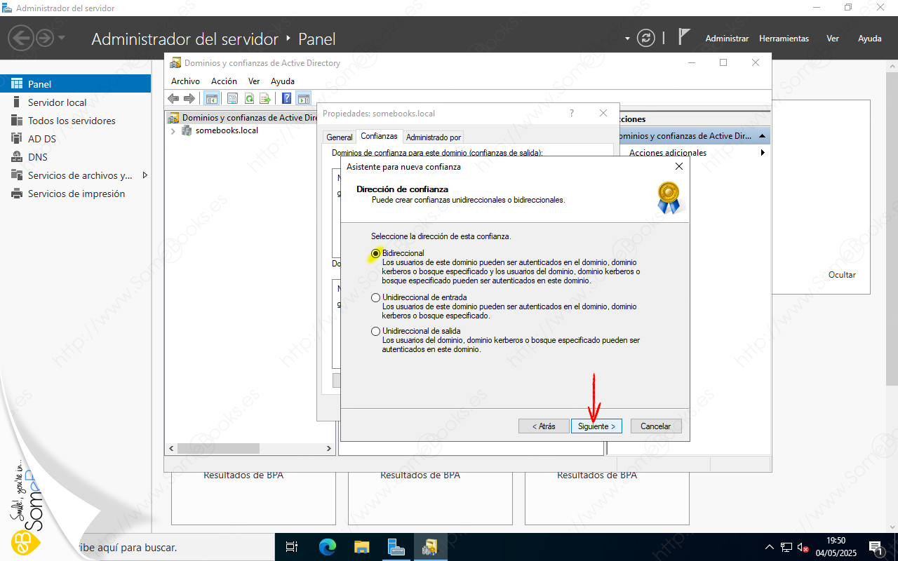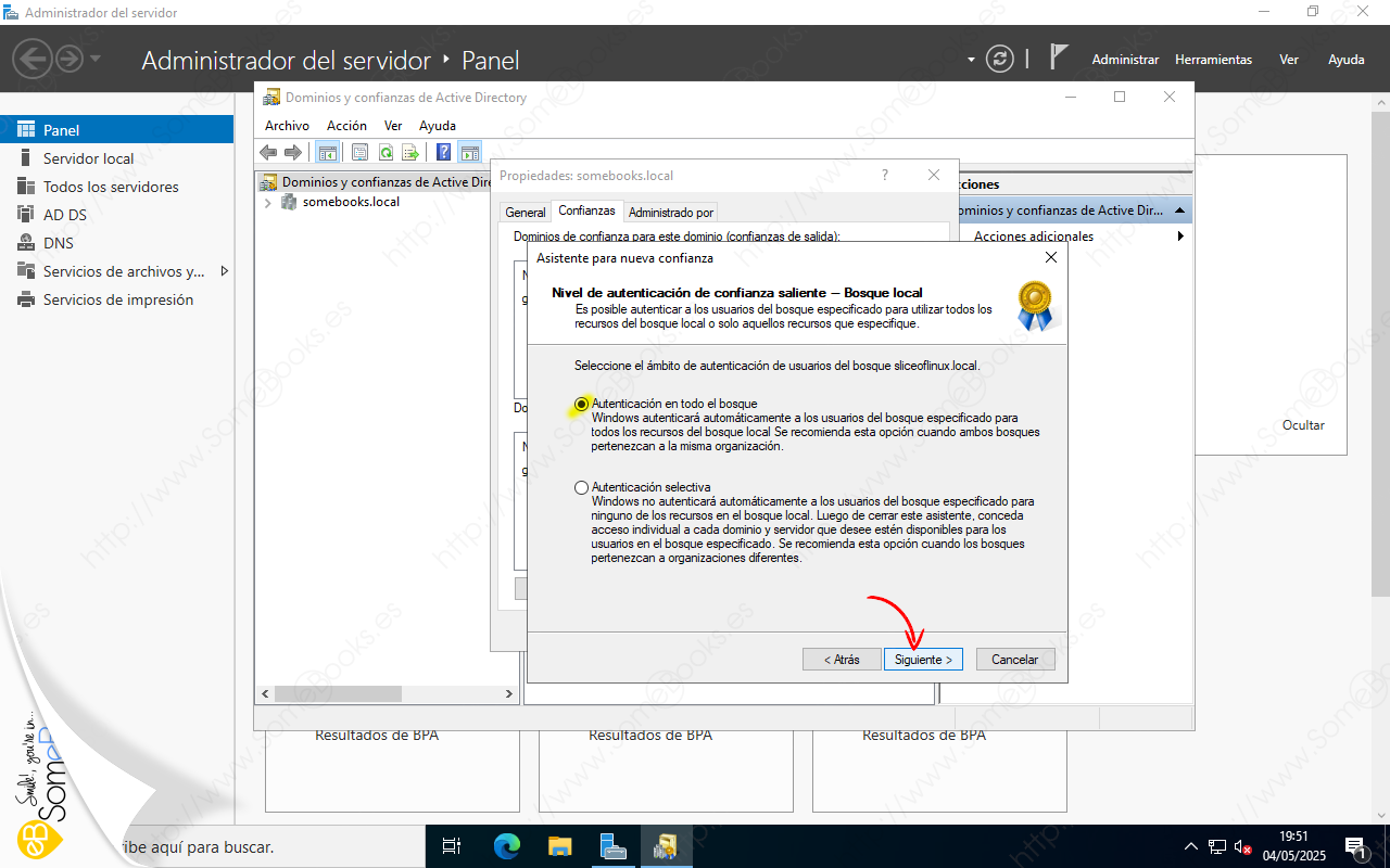 Bidireccional: Con esta opción, cualquier usuario que pertenezca a cualquier dominio del bosque somebooks.local podrá autenticarse en el bosque sliceoflinux.local y cualquier usuario que pertenezca a un dominio del bosque sliceoflinux.local podrá autenticarse en el bosque somebooks.local.