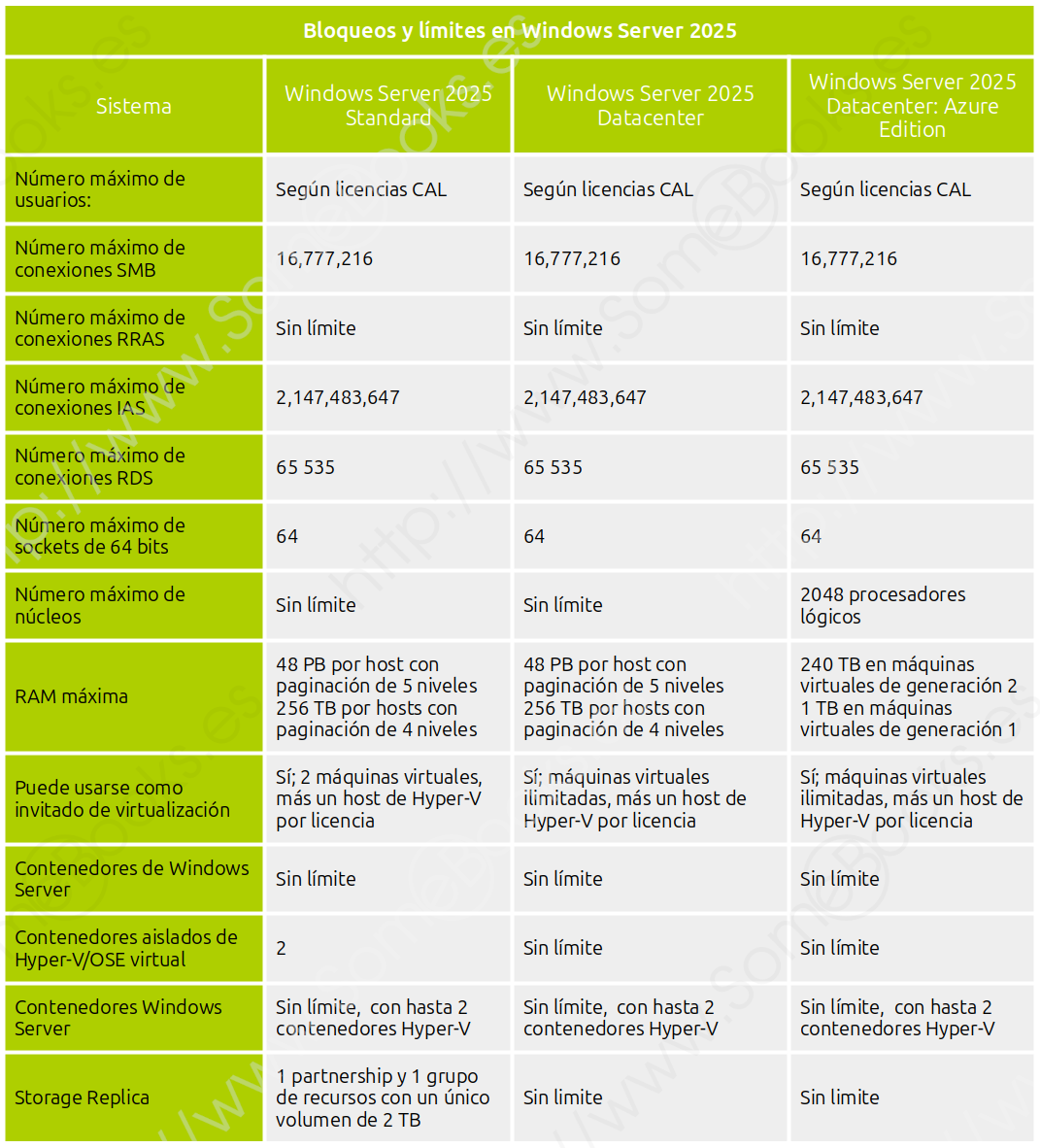 • Windows Server 2025 Datacenter: Aadmite virtualización y contenedores ilimitados, además de todas las capacidades avanzadas de almacenamiento y red. Es la opción adecuada para infraestructuras complejas y altamente virtualizadas.